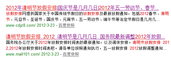 第四和第五是兩個獨立網站,所以出于筆者的愛好,點進去看了下(因為清明節這種放假安排,一般都是大門戶內頁或者政府網站公告占據前排,獨立網站排名這么好,肯定是有SEO操作的。)