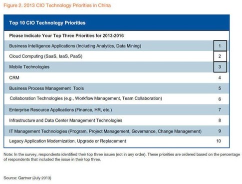 根據(jù)Gartner最新報(bào)告,2013-2016年中國(guó)CIO最關(guān)注的三大技術(shù)應(yīng)用依次是:商業(yè)智能、云計(jì)算和移動(dòng)技術(shù),未來(lái)三年中國(guó)企業(yè)將在這三個(gè)領(lǐng)域加大投入。