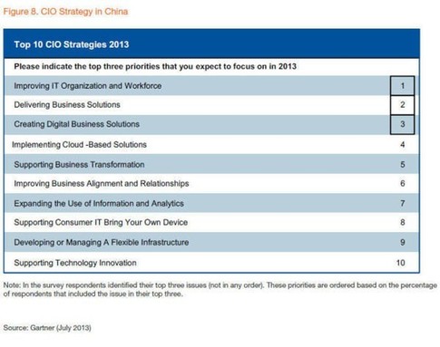 2013年中國(guó)企業(yè)CIO的十大戰(zhàn)略中,前三名按優(yōu)先級(jí)排序依次是 1.提升IT部門(mén)與人員素質(zhì) 2.交付業(yè)務(wù)解決方案 3.開(kāi)發(fā)數(shù)字業(yè)務(wù)解決方案。
