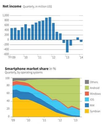 雖然有很多人認為黑莓的下滑是從蘋果 2007年推出第一代 iPhone開始的,但下滑的原因究竟是什么呢?從Gartner信息技術研究和分析公司本周二給出的數(shù)據(jù)來看,在蘋果推出 iPhone 一年之后,也就是2008年6月,黑莓的股價曾一度達到了歷史最高的 150 加元,甚至在 2009 年的時候黑莓在手機市場中所占的比重也相當可觀。事實上,從數(shù)據(jù)可以看出,正是在摩托羅拉 Droid 系列和 Nexus One 開啟了Android平臺的迅猛增長之后,黑莓的業(yè)績才開始出現(xiàn)明顯的下滑。
