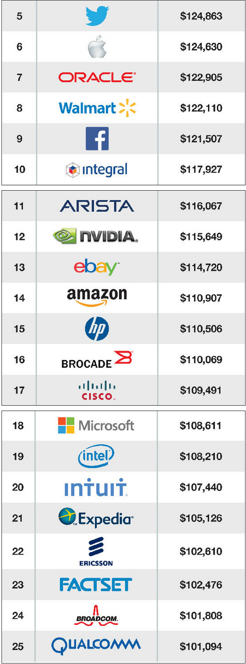 根據Glassdoor,Facebook公司程序員平均年薪為121,507美元,勉強擠進前十,僅位列第九;而微軟在四大互聯網巨頭中排名最低,位列第十八,平均年薪為108,611美元。此外,排名第一位的是Juniper公司,程序員基本年薪接近16萬美元,排名最二十五位的是高通,程序員基本年薪略高于10萬美元。