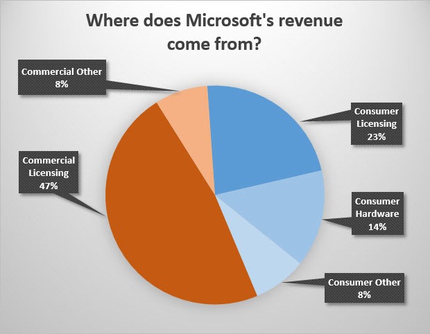 消費者業務方面(圖表中的3個藍色部分),消費者授權覆蓋OEM Windows授權、面向家庭和小商家用戶的Office和Windows Phone。消費硬件包括Xbox硬件、Xbox Live訂閱、Surface產品和諸如鍵盤鼠標的PC配件。其它消費者業務一項則涉及Windows和Windows Phone在線商店、微軟實體店、Xbox游戲與服務、在線廣告(主要來自必應)和Office 365家庭高級版訂閱。