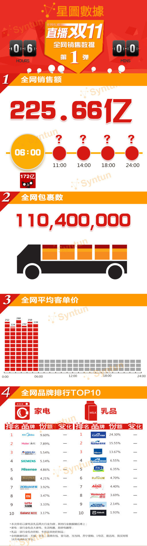截至今天早上六點,全網銷售額225.66億元;全網已有1.1億件包裹;全網平均客單價約為243元;家電類品牌排行:美的獨占鰲頭啊。