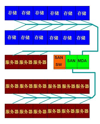 對高性能服務器的布線有兩部分組成,一部分上LAN網絡,另一部分下行SAN存儲網絡。在實際布線方案的實施過程中,筆者有注意到有部分咨詢方在規劃布置該SAN 區域中高性能服務器,存儲設備與SAN交換設備這三者的時候,采用與機架式服務器類似的每列以4-8個設備柜配置一個網絡列頭的方式,這種方式筆者并不推薦,因為這樣會導致被分開擺放于各個列頭的SAN交換設備的布線會變得十分復雜,各個放置SAN交換設備的網絡列頭間為了實現上述多點對多點的連接方式,兩列頭間需要配置大量互連光纖。另外,如果對于高性能服務器每列設置網絡列頭,也并不利于SAN 網絡的布線,高性能服務器一部分光纖上行LAN,一部分下行SAN網絡,如果下行SAN 部分的光纖需要經過網絡列頭跳接,除了浪費布線外,而且也會導致由于跳接次數太多,導致整體通道間的光纖損耗太多,當前的數據中心機房建設在SAN 傳輸通道絕大多數是配置萬兆多模光纜,例如萬兆多模OM3光纖支持萬兆300米的距離下要控制衰減在2.6dB 以下,如果由于整體規劃的原因使得網絡配線跳 接太多而導致整體通道過高的衰減,由于規劃不合理造成過高的衰減將是非常的可惜的,即使以預連接的方案中,也有可能導致衰減過高,經過計算,每列設列頭的 SAN 區域布線方式,SAN網絡的整體通道連接 器有可能達到9個甚至更多的連接點。鑒于以上的分析,對于SAN 區域的布線網絡,筆者更建議采用集中式的配線管理方式,配線區域放置SAN交換設備,而服務器由預連接光纜直接匯聚到配線區,而不是采用上述傳統的列頭方式,這樣的做法通常每個通道的連接點可以控制在5個連接點以下,也更有利于實現該區域的配線的管理,節約用戶的布線投資,集中式 SAN 配線管理如下圖2所示。由于SAN網絡配線相對獨立,并不一定要將SAN 網絡的配線區與LAN的MDA區域放置在一起,這樣做的好處是除了減少該區域光纜的平均長度外,減少布線投資,更重要的是可以減輕LAN 的MDA 配線與線槽路由的壓力,使得配線更清晰,更易管理與維護及今后的擴展。