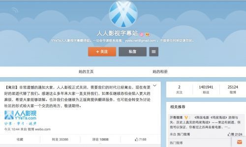 2014年11月21日,人人影視被查封了5臺服務(wù)器。2014年12月20日,人人影視字幕站宣稱正式關(guān)閉。人人影視微博稱:需要我們的時代已經(jīng)離去。