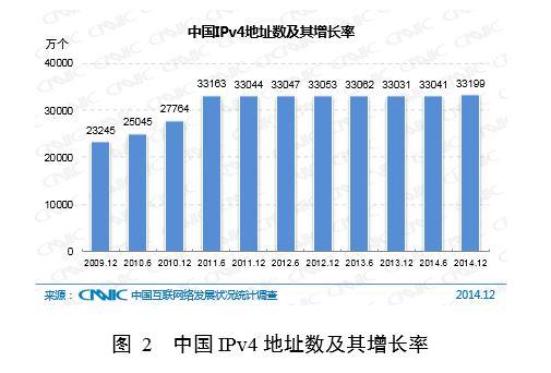 全球IPv4地址數(shù)已于2011年2月分配完畢,自2011年開始我國IPv4地址總數(shù)基本維持不變,截至2014年12月,共計有33199萬個。