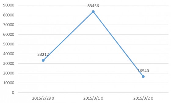 2月28日,上午九點,整個網(wǎng)絡上開始出現(xiàn)對演講者的專訪文字,10點,視頻正式出現(xiàn)。總計為3.3萬原創(chuàng)微博數(shù)量。次日1日,達到頂峰,8.3萬。到了2日,迅速回落。截止到2日的下午1點52分(這個時間點之后,數(shù)據(jù)抓取已經(jīng)無法完成),也只有1.6萬條,即便按全日翻倍計算,3萬條出頭。