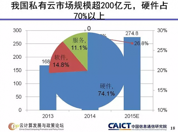 報告顯示,預計2015年我國私有云市場規模將達274.8億元,同比增長26.8%,其中硬件占70%以上。大部分用戶表示,可控性強、安全性好是他們選擇私有云的首要原因,部分用戶還考慮到保護原有投資和方便遷移等因素。企業管理系統是私有云用戶選擇承載在云端的熱門應用,有72.03%的用戶選擇了此項,此外,應用開發與大數據分析、辦公系統以及核心業務系統也是私有云上的主流應用。