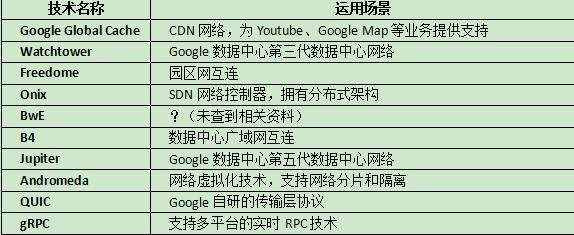 如圖1所示,在過去的近十年間,Google建立的網絡技術體系不但全面覆蓋了眾多的網絡業務場景,并且還在隨著Google業務的開展持續優化。與圖1所示的各項網絡技術相對應的網絡業務場景如表1所示。