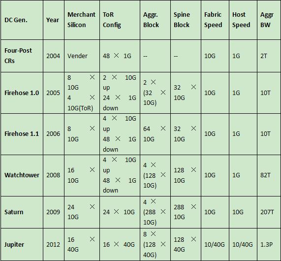 眾所周知,Google數據中心每時每刻都在承擔著海量的來自互聯網的數據訪問。而在當前,Google數據中心內部的網絡流量已經超出了其數據中心與外部互聯網之間的流量。為了應對如此之大的數據流量壓力,Google數據中心網絡一直在持續提升其網絡轉發層的性能,相關的數據如表2所示。
