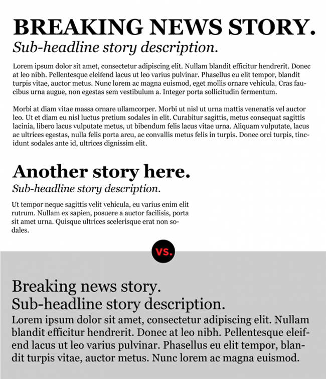 在排版中,層次這個詞是區(qū)分文本和不同元素的重要性區(qū)別的學(xué)術(shù)性說法。以我們所熟知的報紙為例,標題闡述核心,尺寸最大,文字大寫,粗體強調(diào),其次是副標題,字體小點,文字不再大寫,再其次是正文,字體最小。如果打破了這種層次結(jié)構(gòu),用戶會迷惑。哪個重要哪個其次,傻傻分不清楚。