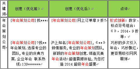 1. 創意撰寫水平:創意圍繞關鍵詞撰寫得越通順、越有吸引力,則越好。這里客戶容易進入誤區,認為創意是越多越好,其實不是。當客戶的賬戶結構搭建健康(如何搭建健康賬戶—參考:http://m.3cym.cn/idcnews/Article/20161212/11178),創意建議一長一短兩條就足夠了。關鍵要寫的有新意,能吸引網民。這里建議僅供參考。