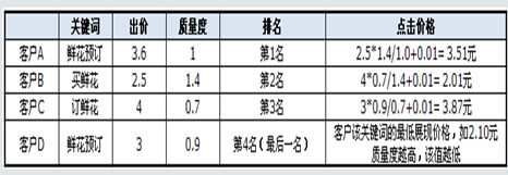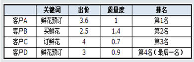 例如,搜索詞“鮮花預訂”,在北京地區有如下四個客戶的推廣結果可以展現(示例中數值僅供參考,不具有實際意義):