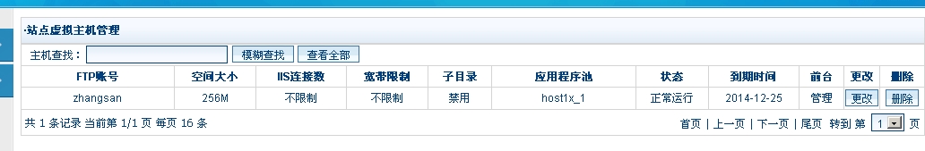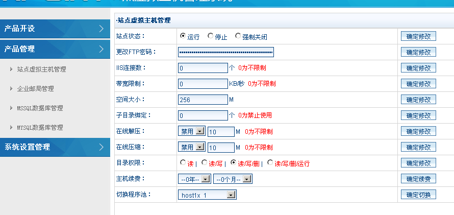 2、通過(guò)-管理-進(jìn)入前臺(tái)主機(jī)控制面板,管理員可以在這里查看主機(jī)信息更改主機(jī)狀態(tài)父路徑狀態(tài)獲取使用空間和對(duì)日志進(jìn)行操作。基本管理功能還包括: 域名綁定、默認(rèn)文檔、子目錄域名綁定、在線壓縮文件、在線解壓文件、自定義錯(cuò)誤、修改登錄密碼。高級(jí)管理功能包括:ASP.NET版本切換、P訪問(wèn)限制、執(zhí)行權(quán)限、調(diào)試標(biāo)志、腳本錯(cuò)誤.。