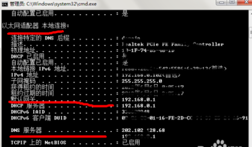 (3)如果(2)沒有問題,那你再輸入ping 你的網(wǎng)關(guān)地址,即你的路由器地址或者交換機的網(wǎng)關(guān)地址,一般為192.168.0(或者1).1。網(wǎng)關(guān)具體獲取方法是在命令行輸入ipconfig/all,然后找到你當前連接網(wǎng)絡(luò)類型對應(yīng)的網(wǎng)關(guān)地址,如圖:圖中第二條紅線