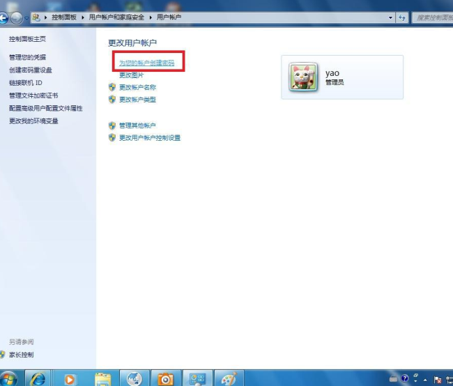 4、進入”用戶賬戶“選項后,點擊”為您的賬戶創建密碼“選項,進入下一步。如下圖: