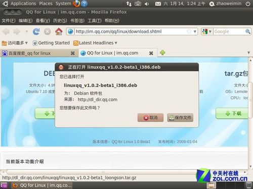 本文中用的版本為Ubuntu10.10。該版本可以說Ubuntu的經典版本,應用范圍非常廣。首先,在Ubuntu桌面打開火狐瀏覽器,輸入網址:http://im.qq.com/qq/linux/download.shtml