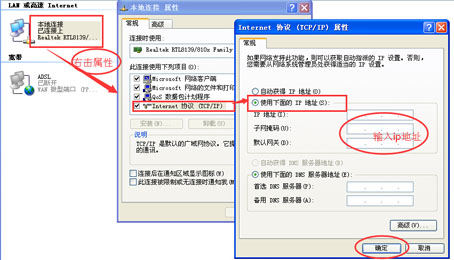 在“控制面板→網(wǎng)絡(luò)連接→本地連接→右鍵屬性→Internet協(xié)議(TCP/IP)→屬性→使用下面的IP地址”,