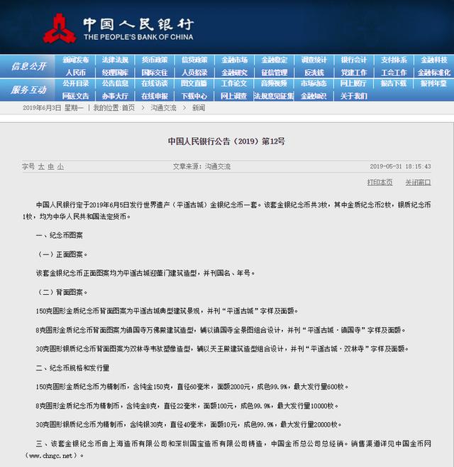中國人民銀行定于2019年6月5日發行世界遺產(平遙古城)金銀紀念幣一套。該套金銀紀念幣共3枚,其中金質紀念幣2枚,銀質紀念幣1枚,均為中華人民共和國法定貨幣。