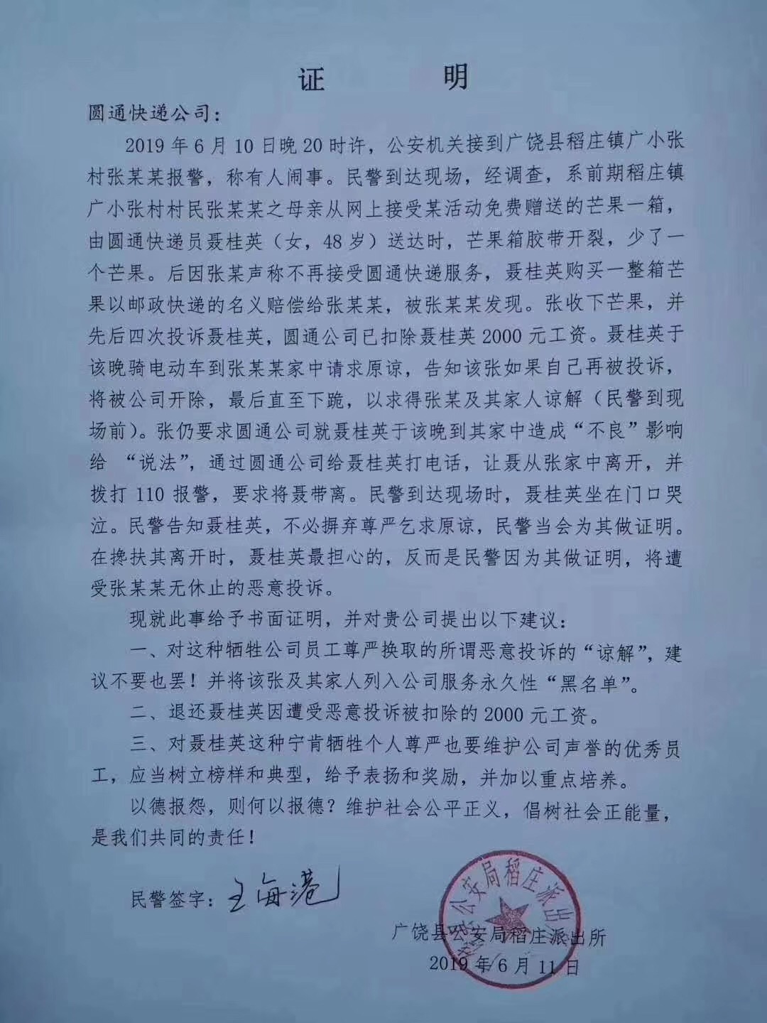 6月11日,一張落款山東省廣饒縣稻莊派出所的《證明》在網絡流傳,《證明》顯示,因包裝開裂少一個芒果,48歲圓通女快遞員賠償一整箱后依然遭到惡意投訴,被扣除工資2000元。快遞員為求諒解直至下跪。投訴者卻撥打110,要求民警將其帶離。