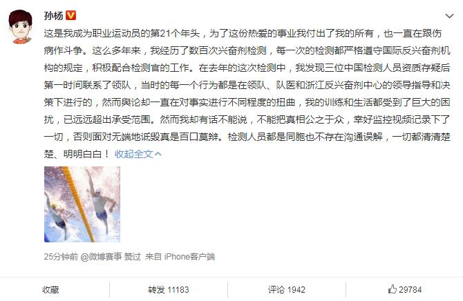孫楊回應拒檢風波在微博上寫道:這是我成為職業運動員的第21個年頭,為了這份熱愛的事業我付出了我的所有,也一直在跟傷病作斗爭。這么多年來,我經歷了數百次興奮劑檢測,每一次的檢測都嚴格遵守國際反興奮劑機構的規定,積極配合檢測官的工作。在去年的這次檢測中,我發現三位中國檢測人員資質存疑后第一時間聯系了領隊,當時的每一個行為都是在領隊、隊醫和浙江反興奮劑中心的領導指導和決策下進行的,然而輿論卻一直在對事實進行不同程度的扭曲,我的訓練和生活都受到了巨大的困擾,已遠遠超出承受范圍。然而我卻有話不能說,不能把真相公之于眾,幸好監控視頻記錄下了一切,否則面對無端地詆毀真是百口莫辯。檢測人員都是同胞也不存在溝通誤解,一切都清清楚楚、明明白白!