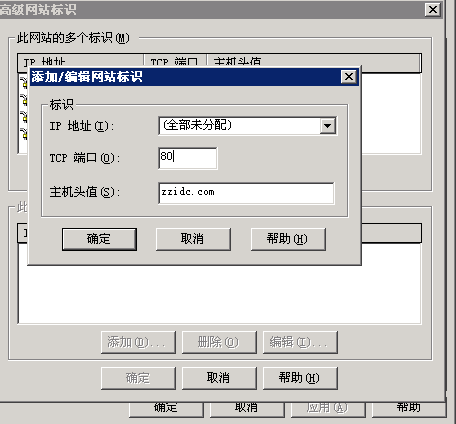 第三步,進(jìn)入“高級網(wǎng)站標(biāo)識”屬性面板后,保持“ip地址”、“TCP端口”、“主機(jī)頭值”下原有的默認(rèn)值不變,點擊選擇“添加”按鈕,出現(xiàn)“添加\編輯網(wǎng)站標(biāo)識”的對話框,保持“IP地址”默認(rèn)值不變,將“TCP端口”設(shè)置成“80”,“主機(jī)頭值”是你要綁定的域名,可輸入你要綁定的網(wǎng)址,設(shè)置完成后點擊“確定”按鈕保存即可,如下圖: