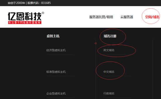 二、通過(guò)億恩科技首頁(yè),找到空間/域名導(dǎo)航欄目,鼠標(biāo)放上后下面會(huì)顯示域名注冊(cè)、英文域名、中文域名等信息,點(diǎn)開域名注冊(cè)按紐進(jìn)入注冊(cè)域名詳情頁(yè)。