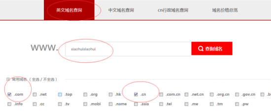 注意查詢的時(shí)候不用輸WWW,空格里邊輸入所要注冊(cè)的域名,比如說(shuō)你要注冊(cè)的域名是www.xiaohuixiaohui.com或www.xiaohuixiaohui.cn如上圖所示,空格處輸入xiaohuixiaohui在下面選擇COM或CN的后綴,(比較常用的是.com和.cn)然后點(diǎn)擊查詢域名即可。