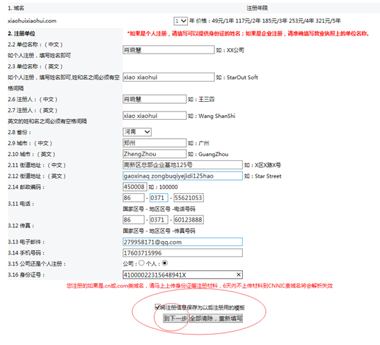 注意:整個(gè)域名注冊(cè)信息頁(yè)面,域名所有人必須真實(shí)有效,個(gè)人填寫個(gè)人身份證上的名字,企業(yè)填寫營(yíng)業(yè)執(zhí)照上的名字,英文信息填寫中文所對(duì)應(yīng)的拼音或英文信息,注冊(cè)聯(lián)系人為個(gè)人本人或企業(yè)的負(fù)責(zé)人或法人都可以,下面地址電話信息要真實(shí)有效,以及證件資料,選擇個(gè)人對(duì)應(yīng)身份證件號(hào),選擇企業(yè)對(duì)應(yīng)營(yíng)業(yè)執(zhí)照號(hào)。到下一步提交信息,即預(yù)注冊(cè)成功,如下所示: